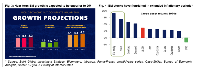 Aktier i tillväxtmarknader har historiskt sett haft stark utveckling när USA börjar sänka räntan och dollarn försvagas. Även om en lättnad från den amerikanska centralbanken (FED) kan ha blivit försenad på grund av ihållande inflation, finns det fortfarande förväntningar om räntesänkningar i år. Faktum är att tidigare perioder med ihållande inflation, som på 1970-talet, har visat att aktier i tillväxtmarknader har presterat bättre än andra tillgångsklasser, följt av värdeaktier (fig. 4).