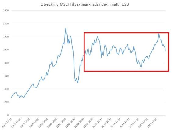 Utvecklingen för tillväxtmarknadernas aktiemarknader har påverkats av oro för handelskrig, ökade räntor, politiska problem och mer därtill. Som ett resultat har MSCI:s tillväxtmarknadsindex fallit mer än 15 procent hittills i år. Efter den senaste nedgången är utvecklingen i stort sett oförändrad sedan finanskrisen, mätt i dollar.