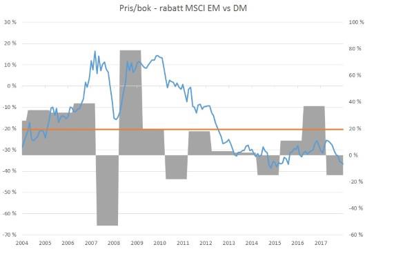 Efter rabatter på 37-38 procent år 2015 ökade tillväxtmarknaderna med 11 procent 2016 och 37 procent 2017, båda mätt i dollar. Omvänt, var det högre priset för tillväxtmarknader mot utvecklade marknader mätt till bokfört värde som störst 2009. Efter det föll avkastningen kraftigt. Åren kring finanskrisen är naturligt nog inte med i beräkningen, det var en speciell period med stora fluktuationer i aktiekurserna, och därmed också värderingarna mot bokfört värde.
