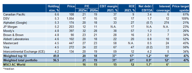 Fondets soliditet betyr at det ikke har vært noen betydelige tap blant de 30 beholdningene, og porteføljeforvalterne har utnyttet kursnedganger til å øke flere posisjoner. De største negative bidragsyterne i 2024 har vært Accenture, som er blitt overskygget av konkurrenter med tettere bånd til AI, logistikkselskapet DSV som har blitt påvirket av redusert økonomisk aktivitet, og Nike som har slitt med å komme seg etter pandemien, selv om merkevaren forblir sterk.