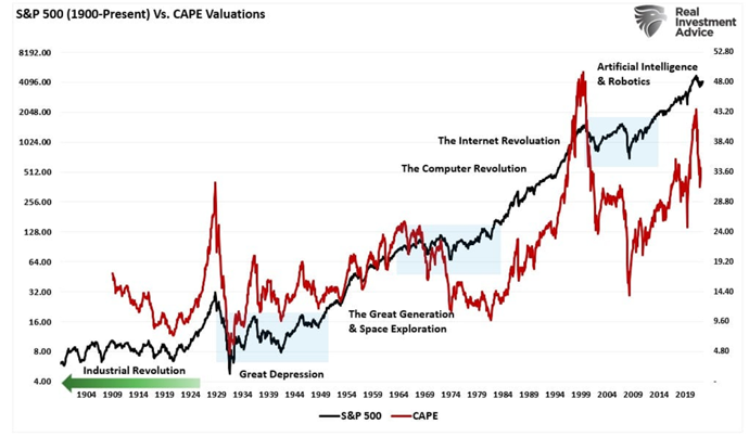 Tidligere perioder med teknologisk udvikling har været sammenfaldende med nogle af de perioder med bedst afkast på aktiemarkedet. Men før begejstringen løber helt af med os, så viser historien os også vigtigheden af værdiansættelser. Grafen nedenfor viser S&P 500-indeket (den sorte linje) mod det cyklisk justerede Price/Earnings-ratio (den røde linje), hvor de blå perioder indikerer perioder uden afkast. Grafen viser os, at perioder med hurtig digital udvikling ikke lader sig oversætte til gevinster på aktiemarkedet, hvis prisfastsættelserne er høje, som de er nu.