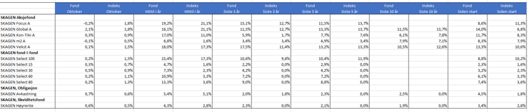 Til trods for modvind for de globale aktier havde lokale investorer fordel af en svag norsk krone. Den nordisk-globale aktiefond SKAGEN Vekst havnede bag sit indeks i oktober med -4,40 pct. i afkast mod indeksets -3,06 pct.