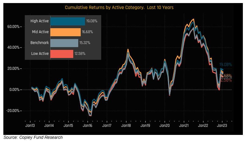 Men der er også meget andet, der peger på, at markedsforholdene kunne gå hen og blive bedre for de aktive forvaltere. Det ses allerede på præstationer blandt de aktive forvaltere i 2022. Afslutningen på en periode med store kvantitative lempelser og en ny æra med et højere rentemiljø bør også udjævne spillepladen. Specielt hvis den vedvarende høje inflation tvinger investorerne i retning af afkast, der kan slå frem for blot at mime indekset, i et forsøg på at beskytte deres opsparinger og købekraft.