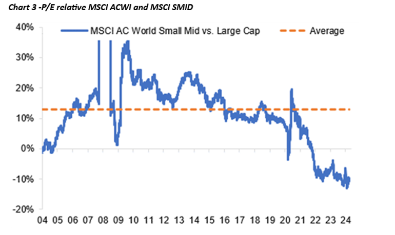 Vi kan illustrere den nåværende interessante investeringsmuligheten gjennom det store gapet i verdsettelsesmultiplene mellom globale små og mellomstore selskaper sammenlignet med store og megastore selskaper. Vi har tidligere omtalt dette som "Det storslåtte gapet", som vi mener tilbyr et langt mer interessant fokus enn "Magnificent 7". Det kan oppsummeres slik:
