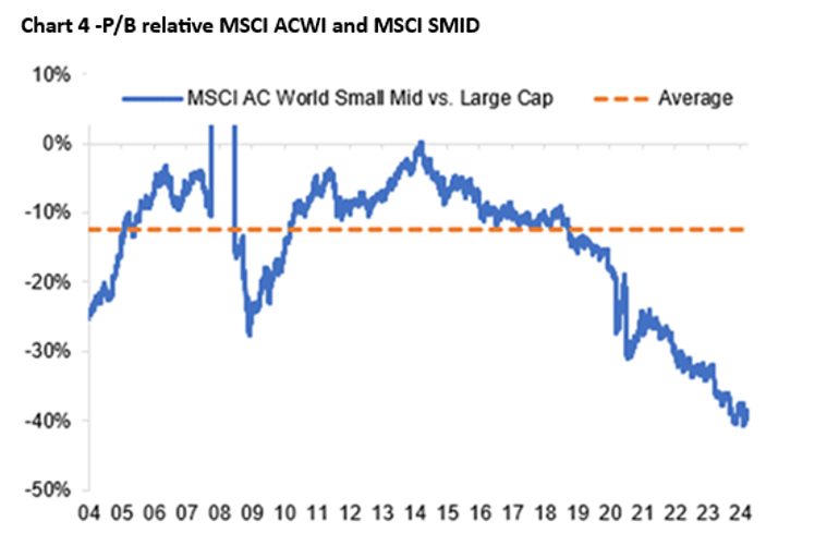 På P/B-basis fortsetter rabatten for globale småselskaper mot store selskaper å øke: