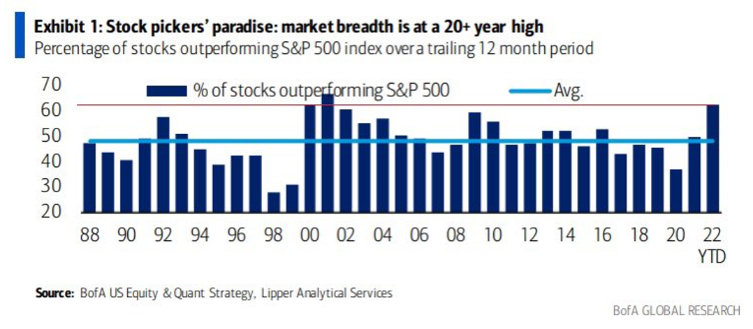 Til trods for den korte og dermed lident repræsentative periode, viser afkastet for de fleste af vores fonde, sammenlignet med referenceindekset, hvorfor aktiv forvaltning har en række fordele. For eksempel blev det meget tydeligt, at det er godt at vælge individuelle aktier fremfor passivt at følge markedet, hvilket kan illustreres af USA, hvor mega-cap-vækstselskaberne gjorde det dårlig og trak hele markedet med sig nedad. Hele 58 pct. af aktierne leverede et bedre afkast end markedet (se figuren) og gjorde, at de fleste aktive forvaltere slog indekset (3).