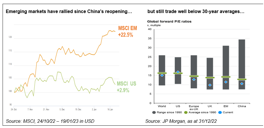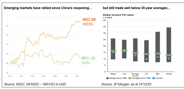 Et godt eksempel er vækstmarkederne, som har fået et løft, efter Kina har lettet sine COVID-restriktioner, godt hjulpet af en svækket dollar, men hvor værdiansættelserne fortsat er gode, hvilket altså vil sige under det langsigtede gennemsnit. Lignende rabatter finder vi i Europa men ikke i USA, hvor priserne fortsat er over gennemsnittet. Den store forskel i værdiansættelsen giver gode forudsætninger for aktive forvaltere til at levere merafkast.