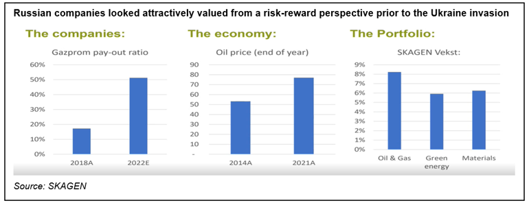 Med en oliepris på 75 amerikanske dollars per tønde i starten af året har den russiske økonomi og virksomheder været velpositionerede i forhold til at modstå mulige sanktioner. Sanktioner i samme omfang som dem, de blev pålagt i forbindelse med annektering af Krim i 2014, hvor olieprisen var en tredjedel billigere. Porteføljen i SKAGEN Vekst har også været eksponeret mod aktier uden for Rusland, som højst sandsynligt ville få fordel af de afledte effekter af krigen, herunder materialer og energi.