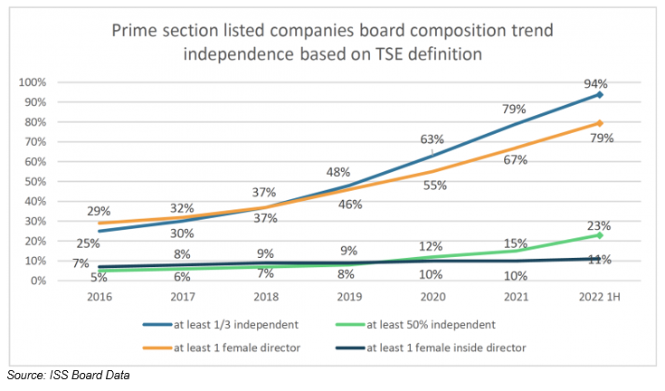 I Japan har man fra statslig side gjort meget for at forbedre ledelsen i japanske selskaber – hovedsageligt gennem reformer gennemført af Shinzo Abe – og for at tackle manglen på eksterne medlemmer i bestyrelserne. I 2021 revurderede de japanske politikere reglerne for virksomhedsledelse, hvilket betød at mindst en tredjedel af direktørerne i selskaber noteret på børsen i Tokyo skulle være uafhængige. Tallet er steget fra 25 pct. af selskaberne i 2016 til 94 pct. i 2022 ifølge ISS-data (3).