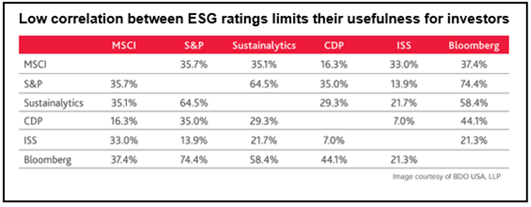 De mange forskellige metoder, som bliver brugt, kan skabe vidt forskellige resultater og fører ofte til selvmodsigende anbefalinger. Et nyligt CFA-studie af de seks største udbydere af ESG-vurderinger, som kortlægger 400 virksomheder på tværs af 24 industrier, viste en lav sammenhængsgrad mellem resultaterne fra de forskellige ratingbureauer. I de fleste tilfælde var korrelationen omkring 50 pct., mens enkelte lå under syv pct (se tabel nedenfor).