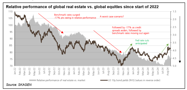 Historisk sett har børsnotert eiendom prestert bedre enn både aksjer og privat eiendom når sentralbankene endrer kurs. For eksempel har amerikanske eiendomsselskaper (REITs) levert en gjennomsnittlig årlig avkastning på 20 prosent siden 1990, ett år etter slutten av en periode med renteøkninger.
