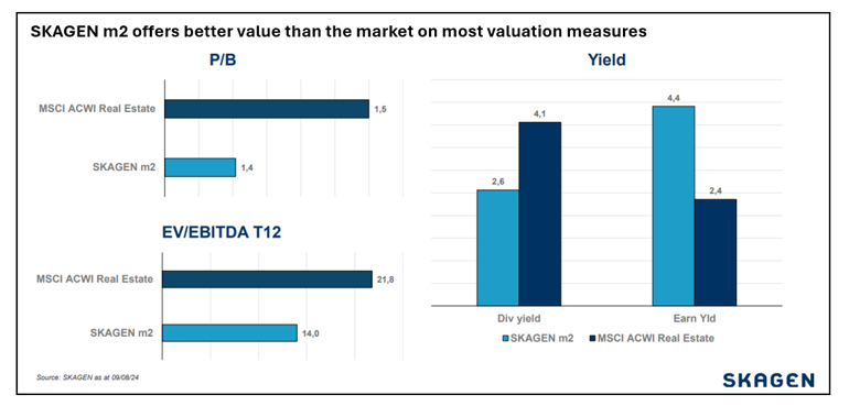 SKAGEN M2 har hatt en oppgang på 1,8 prosent i euro for 2024 og har slått sin referanseindeks over perioder på ett, fem og ti år, takket være gode aksjevalg. Fondet er godt posisjonert for å dra nytte av bedre makroøkonomiske forhold. Porteføljen er innrettet for å dra nytte av fallende renter, og omtrent en femtedel av fondets midler er investert i sektorer som forventes å prestere godt når økonomien tar seg opp, som kontorbygg, detaljhandel, hotell og boliger.