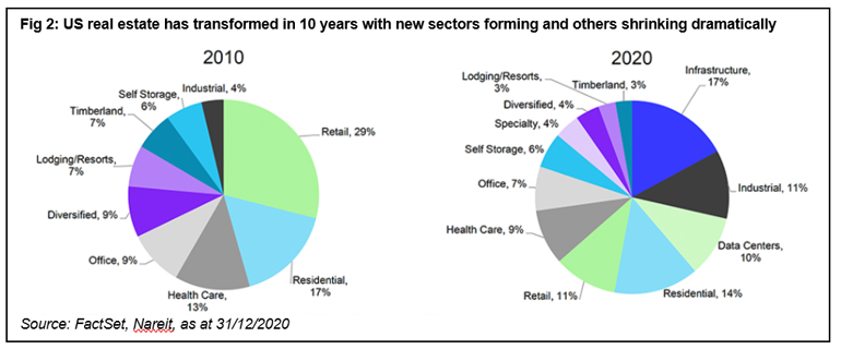 Aktiemarkederne synes dyre lige nu, anskuet med næsten en hvilken som helst historisk brille, mens ejendom er værdiansat blot en smule over sit historiske gennemsnit med beskedne 4 pct. oven i nettoværdien (NAV). Det er sandt, at det ikke isoleret set er bevis for den helt store forskel mellem forskellige segmenter og lande[3]. Men ejendomsmarkedet er et af de mest dynamiske markeder i verden, og der defineres kontinuerligt nye subkategorier og geografiske særegenheder, som giver friske muligheder for investorerne. Det seneste årti har det amerikanske marked, der er aktivklassens største, ændret sig, og særligt erhvervsejendom er skrumpet ind, mens infrastruktur og datacentre er gået fra at fylde det rene ingenting til nu at udgøre knap en tredjedel af markedet.