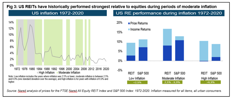 Øget inflation vil efter alt at dømme også give medvind inden for ejendomssektoren. Historisk har ejendom i hvert fald været et godt værn mod stigende priser, idet lejeaftaler plejer at være inflationsjusterede. Værdien på bygningerne fastholdes også typisk, idet prisen på arbejdskraft og materialer til nybyggeri stiger. Inflationen i USA i USA er aktuelt 5,3 pct., et niveau hvor REITs historisk har leveret bedre afkast end de globale aktiemarkeder.