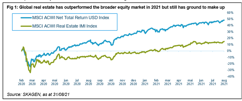 [2] Kilde: index data: MSCI. MSCI ACWI IMI Real Estate Index vs. MSCI ACWI Index. Kilde land- og sektordata: Datastream, UBS. All as at 31/08/21 i USD.