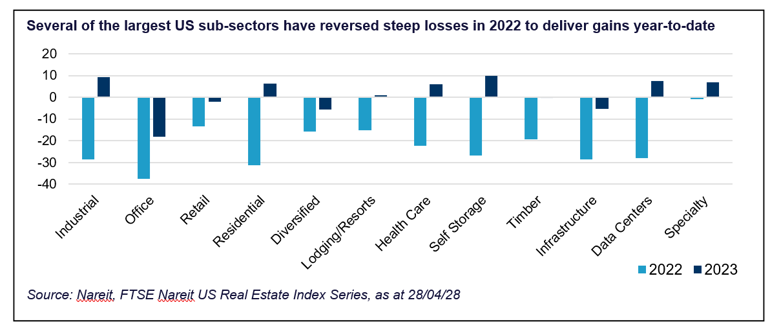Makroøkonomiske forhold, specielt inflationen og renteudsigterne, har påvirket investortilliden. Det afspejles i det brede men spredte frasalg, vi så i fjor på tværs af alle ejendomssegmenter i USA. Den fremgang, vi så i begyndelsen af i år, har været præget af samme uforudsigelige spredning, fællesnævneren mangler. Med undtagelse, dog, af inden for kontorejendom, hvor bekymringerne for økonomiens slagkraft og den faldende efterspørgsel efter pandemien fortsat påvirker investorernes appetit.