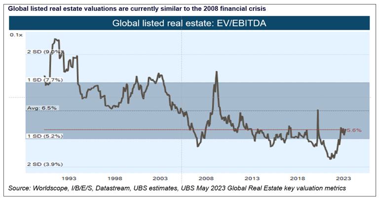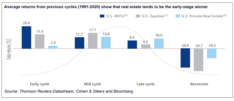 Global ejendom er lige nu værdiansat omkring en femtedel under sit gennemsnitlige niveau for de seneste 30 år, og tabene i de amerikanske ejendomsfonde er på niveau med tabene i tidligere faser med recession. Tidligere har børsnoteret ejendom giver stærke afkast i forhold til konventionelle aktier og direkte ejet ejendomme, når en cyklus vender.