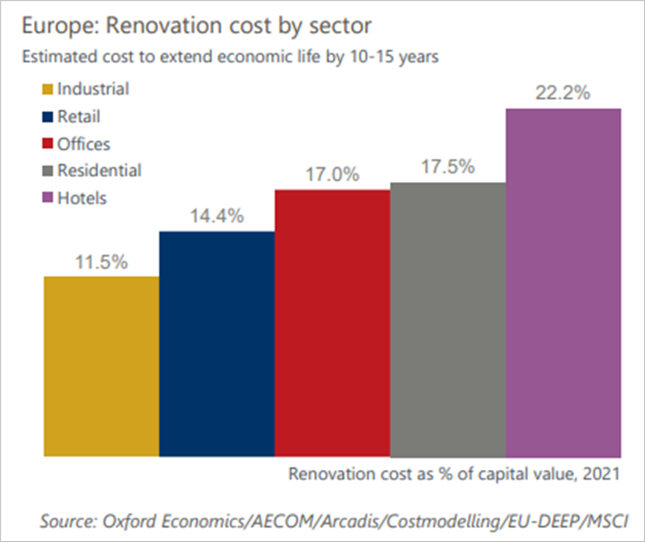 De renovationer, der kræves for at reducere CO2-udledningen i eksisterende byggeri, vil medføre øgede omkostninger på tværs af de europæiske ejendomsmarkeder. En nylig rapport fra Oxford Economics estimerer, at det vil kræve op til 30 pct. af kapitalværdien at renovere en ejendom for at forlænge levetiden med blot 10-15 år (1). Det regnestykke giver udfordringer for investorerne, specielt i visse af ejendomssektorens subsegmenter som fx hoteller. Her er bygningerne nemlig ofte ældre, har unikke beliggenheder og et højere niveau af energiintensitet. Omvendt vil porteføljer, der er vægtet mod industri- eller detailbyggeri pådrage sig væsentligt færre omkostninger.