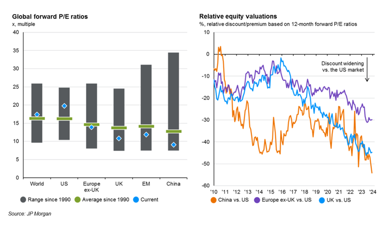 En etterskrift til årsavslutningsrallyet er at verdsettelsene i utviklede markeder nå er over historiske gjennomsnitt, særlig i USA hvor overskriftstallene blir skjevfordelt av MAG-7. I Europa (spesielt Storbritannia) og fremvoksende markeder (spesielt Kina) er verdsettelsene fortsatt godt under 30-årsgjennomsnittene, mens deres relative rabatter til amerikanske aksjer er på rekordnivåer og fortsetter å vokse. En fordel med bottom-up-investering er at selv i USA, hvor 70 prosent av aksjene underpresterte indeksen i fjor og omtrent en tredjedel faktisk falt i pris, finnes det verdi å finne.