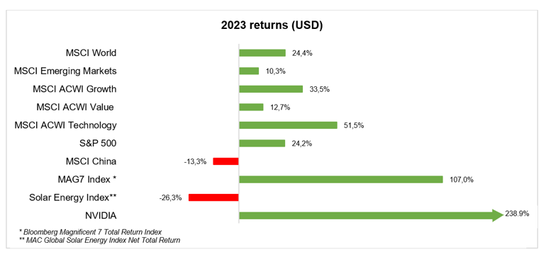 Dette lite sannsynlige "Goldilocks-scenarioet" bidro til at globale aksjer avsluttet 2023 med en oppgang på 23 prosent, og leverte det beste årsresultatet siden 2019[2]. Som det er blitt bredt rapportert om, sto 'De Fantastiske Syv' for mesteparten av denne oppgangen, og drev den amerikanske S&P 500-indeksen (der Alphabet, Amazon, Apple, Meta, Microsoft, Nvidia og Tesla nå utgjør 30 prosent) til nye høyder. Samtidig hadde Nasdaq 100-indeksen, som består av store teknologiaksjer, sitt beste år siden dotcom-boblen sprakk, med en økning på over 50  prosent.