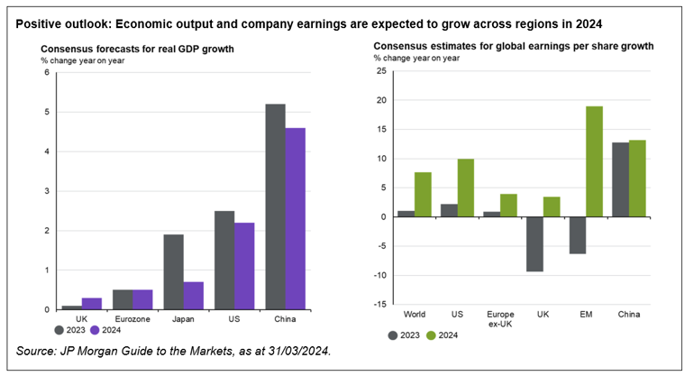 Bak oppsvinget ligger bedre økonomiske og inntektsmessige utsikter. Det forventes vekst i BNP i de fleste regioner, og arbeidsmarkedene verden over holder seg sterke. Inflasjonen fortsetter generelt å falle, om enn saktere enn forventet i mange land, og rentekutt ligger i kortene som et resultat. Med investorer som stadig blir mer overbevist om at vi vil oppnå en myk økonomisk landing og unngå en resesjon, forventes det vekst i selskapsinntektene i alle de store markedene.