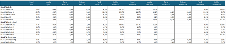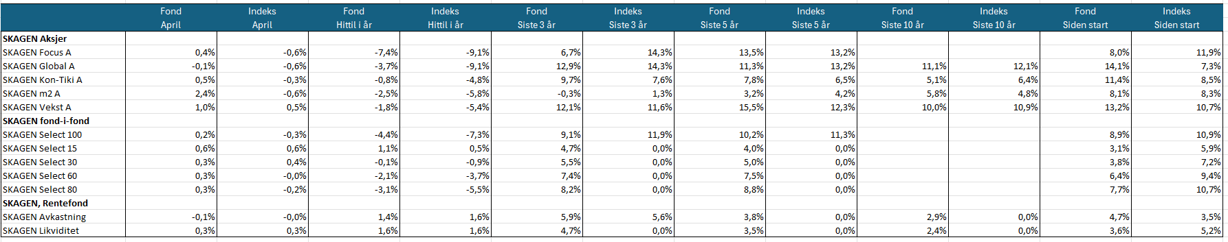SKAGEN Focus slo referanseindeksen også i april, og leverte 0,4 prosent i måneden mens indeksen falt 0,6 prosent tilbake. Se flere avkastningstall nederst i artikkelen.