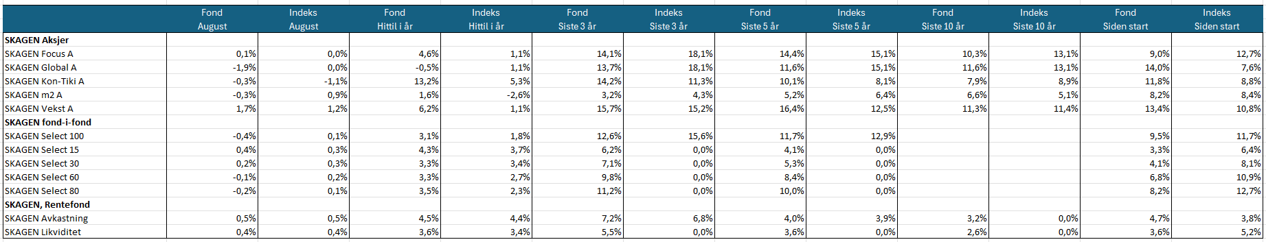 Historisk afkast er ingen garanti for fremtidig afkast. Andre faktorer, blandt andet markedsudviklingen, porteføljeforvalterens dygtighed, fondens risiko samt omkostninger, kan påvirke fremtidigt afkast. Afkast kan blive negativt som følge af kurstab. Der er risici tilknyttet investeringer i fonde på grund af markedsbevægelser, valutaudvikling, renteudvikling, konjunkturer, samt branche- og selskabsspecifikke forhold. Fondene er denomineret i norske kroner (NOK). Afkast kan stige eller falde som følge af valutaudsving. Før du investerer, anbefaler vi, at du sætter dig ind i fondenes nøgleinformation, prospekter og omkostninger. Du finder nærmere info på www.skagenfondene.dk