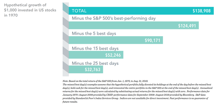 Selvom det kan være fristende at gå over til kontanter, vil bankopsparinger uundgåeligt miste deres værdi i reelle termer med en inflation, der er tæt på tocifret. Markedsfald kan være smertefulde, men papirtab krystalliserer sig først økonomisk, når du sælger. Ved salg risikerer du også at være ude af markedet på positive dage, hvilket har været et træk ved den seneste volatilitet. En undersøgelse viste for nylig, at hvis man bare missede en håndfuld af de bedst ydende dage mellem 1970 og 2019, ville det reducere afkastet med over 35 pct., hvilket sætter det aktuelle markeds fald i kontekst.
