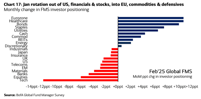 Dette kommer etter en dramatisk vending siden slutten av fjoråret. En global fondsundersøkelse fra Bank of America viste at investorene har økt sine posisjoner i eurosonens aksjer fra en netto undervekt på 25 % i desember til en netto overvekt på 12 % i februar. Samtidig har eksponeringen mot amerikanske aksjer falt fra en topp på 36 % ved årsskiftet til en netto overvekt på 17 %. Ifølge EPFR opplevde den tredje uken i februar de største tilstrømmingene til europeiske aksjefond siden starten av 2022.