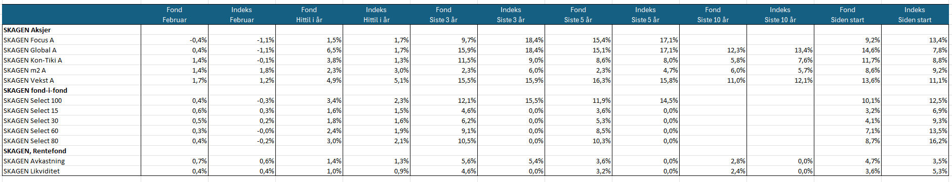 Etter en sterk start på 2025 mistet det amerikanske markedet noe av farten i februar, mens europeiske aksjer steg på bakgrunn av forventninger om geopolitisk avspenning og økt finanspolitisk stimulans. SKAGEN Focus overgikk referanseindeksen med 0,75 prosentpoeng og avsluttet måneden med -0,4 prosent sammenlignet med -1,1 prosent for indeksen. Du finner flere avkastningstall nederst i artikkelen.