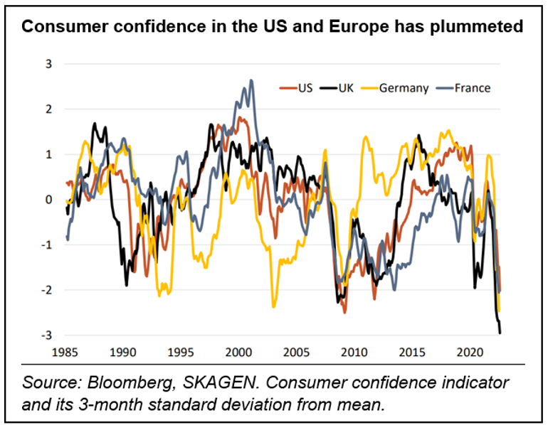 Samtidig stiger frygten for recession, idet forbrugerne er begyndt at skære i deres udgifter som konsekvens af stigende priser på energi og fødevarer. Tilliden er faldet til niveauer, som vi sidst har set i verdensøkonomien under finanskrisen (se grafen), hvilket uundgåeligt vil lægge en dæmper på virksomhedernes forventninger.