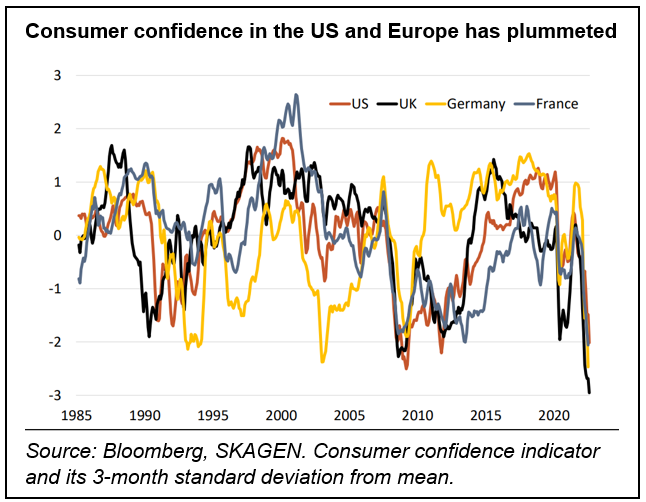 Samtidig stiger frygten for recession, idet forbrugerne er begyndt at skære i deres udgifter som konsekvens af stigende priser på energi og fødevarer. Tilliden er faldet til niveauer, som vi sidst har set i verdensøkonomien under finanskrisen (se grafen), hvilket uundgåeligt vil lægge en dæmper på virksomhedernes forventninger.