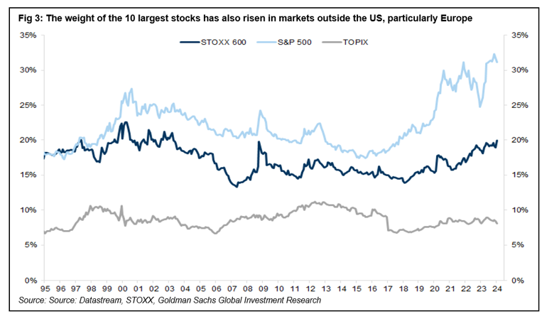Selv om fokuset ofte har vært på "Magnificent Seven" de siste årene, er økende konsentrasjon ikke et rent amerikansk fenomen. Markedene over hele verden har blitt stadig smalere. I vekstmarkedene har de største selskapene bidratt med en større andel av indeksavkastningen over fem år enn i USA, ifølge Morningstar-data, selv om dette har skjedd i en periode med svakere resultater. I Europa, hvor de ti største selskapene nå utgjør nesten en fjerdedel (23 prosent) av indeksen[3], er markedskonsentrasjonen den høyeste siden den globale finanskrisen i 2008.