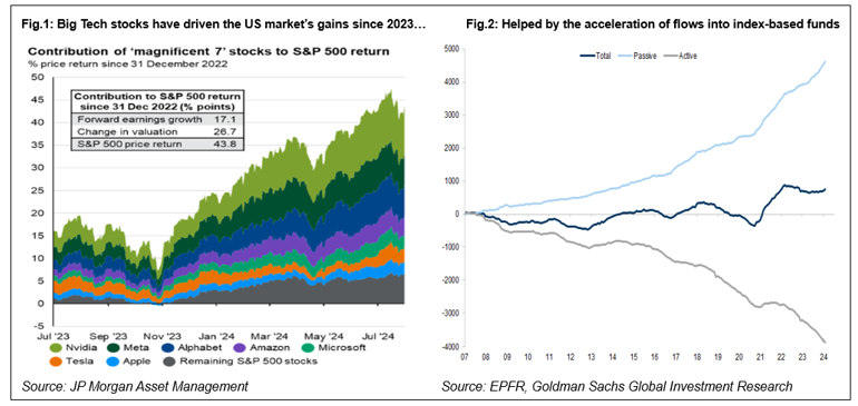 Passive investorer som følger populære globale indekser kan tro at de er diversifisert med lavere risiko, men er i virkeligheten sterkt eksponert mot amerikansk teknologi. De er også i økende grad avhengige av et lite antall dyre aksjer for å generere avkastning, og av at investortilliten til disse forblir høy.