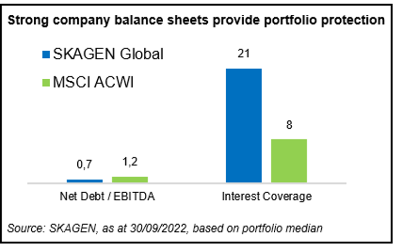 I det nuværende usikre aktiemiljø betyder risikoen for tab mere for investorerne end aktiens vækstpotentiale. Her står SKAGEN Global også stærkt, forklarer Gezelius: "Når tiderne er gode, vælger markedet typisk at se bort fra fejl i forretningsmodellerne og finansielle svagheder, hvilket oftest bliver straffet hårdt i dårlige tider. Derfor foretrækker vi at investere i selskaber, som har modstandsdygtige pengestrømme og solide regnskaber – det nytter jo ikke noget først at bygge diger, når stormfloden har ramt."