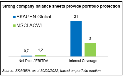 I det nuværende usikre aktiemiljø betyder risikoen for tab mere for investorerne end aktiens vækstpotentiale. Her står SKAGEN Global også stærkt, forklarer Gezelius: "Når tiderne er gode, vælger markedet typisk at se bort fra fejl i forretningsmodellerne og finansielle svagheder, hvilket oftest bliver straffet hårdt i dårlige tider. Derfor foretrækker vi at investere i selskaber, som har modstandsdygtige pengestrømme og solide regnskaber – det nytter jo ikke noget først at bygge diger, når stormfloden har ramt."