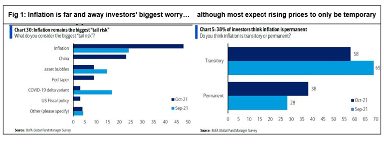 Det er muligvis grådighed, der er den mest dominerende last på aktiemarkederne, men følelsen af frygt er heller aldrig langt væk. Ifølge Bank of Americas Global Fund Manager-undersøgelse fra oktober er det fortsat inflationen, der udgør den største risiko, når man spørger investorerne. Selv om antallet af investorer, som mener at inflationen er den største trussel, er faldet, så ser de fleste det stadig det nuværende klima som en overgangsperiode. Kina landede som nummer to på samme liste over mulige risici, hvilket skyldes den fortsatte usikkerhed i forbindelse med ejendomsgiganten Evergrande og bekymringen for yderligere statslig regulering.