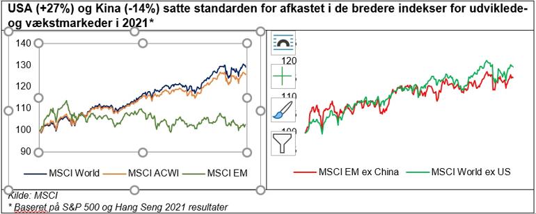 Der er ingen tvivl om, at 2021 var en behagelig afveksling fra året før. Det globale indeks MSCI All Country World Index oplevede flere rekorder i løbet af året og endte på en 26 pct. øgning ved udgangen af 2021. Det til trods var der store forskelle mellem de geografiske markeder. De udviklede markeder steg 26 pct., mens vækstmarkederne steg to pct. Det er den største forskel i ti år, der hovedsageligt blev drevet af et vedvarende stærkt USA og et særligt svagt Kina, som begge udgør hovedparten af deres respektive indekser[1].