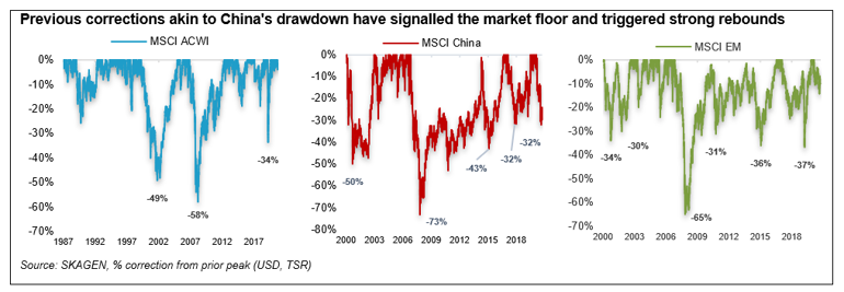 Den seneste kinesiske nedsmeltning er faktisk femte gang, aktierne her er faldet med mere end 30 pct. alene siden årtusindeskiftet. Det seneste fald svarer i øvrigt til den forrige korrektion i 2018, hvor Kina lå i handelskrig med USA. Til sammenligning er globale aktier faldet med 30 pct. af tre omgange over den samme periode, mens vækstmarkederne har lidt samme skæbne seks gange. På tværs af alle markeder har disse heftige korrektioner været et signal om, at markedet har ramt bunden, og er hver gang blevet efterfulgt af en kraftig stigning.