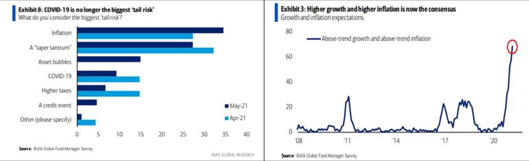 Efter et år med store bekymringer for de økonomiske tilbageslag, som COVID kan resultere i, har investorerne nu noget andet at bekymre sig over. Det er i hvert fald det billede, der tegner sig i Bank of Americas globale forvalterundersøgelse. Den seneste udgave af undersøgelsen viser nemlig, at inflation nu anses for at være den største risiko for aktiekursen. Undersøgelsen afdækker, at der forventes kraftigt stigende inflation og det højeste prisniveau siden første gang undersøgelsen blev foretaget i 2008: