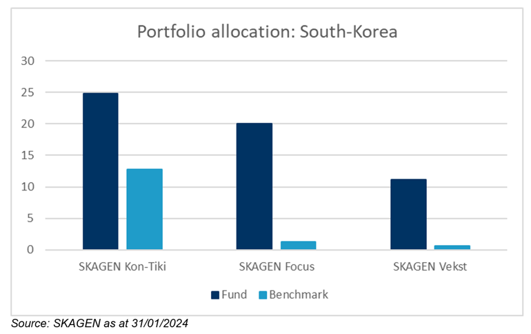 Også den bredere KOSPI-indeksen har steget, med 5 prosent siden slutten av januar. Det kan komme mer oppsving senere i år fra valgene, ettersom politikere ønsker å tiltrekke seg private investorer, som nå utgjør 30 prosent av Koreas stemmeberettigede befolkning. Regjeringen og tilsynsmyndighetene ønsker bedre selskapsstyring for å øke verdsettingen og utbyttet til aksjeeiere, noe som er positivt for SKAGEN Kon-Tiki, SKAGEN Focus, og SKAGEN Vekst, som alle har en stor del av sine investeringer i Korea.
