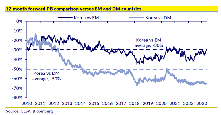 Verdsettelsesgapet er spesielt stort innen banksektoren i Korea, hvor selskapene ofte vurderes mye lavere enn hva de egentlig er verdt, og har lave inntjeningsmultipler på grunn av dårlig kapitalforvaltning. Selv om de genererer lignende avkastning på egenkapitalen som sine internasjonale motstykker, har koreanske banker tradisjonelt sett vært dårlige til å dele profitten med sine aksjeeiere.