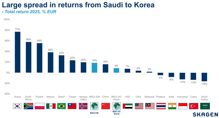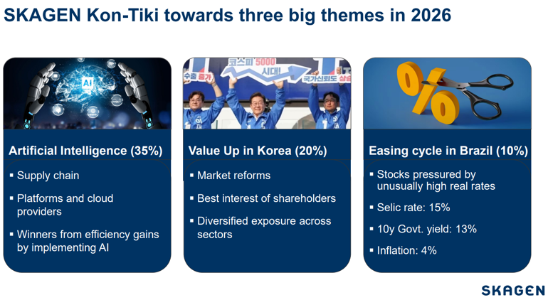 Den positive utviklingen i fremvoksende markeder har fortsatt inn i 2026. Halvledersektoren i Korea og Taiwan viser fortsatt sterk fremdrift, samtidig som Brasil har fått et tydelig løft. SKAGEN Kon‑Tikis portefølje er godt posisjonert for å dra nytte av disse trendene.